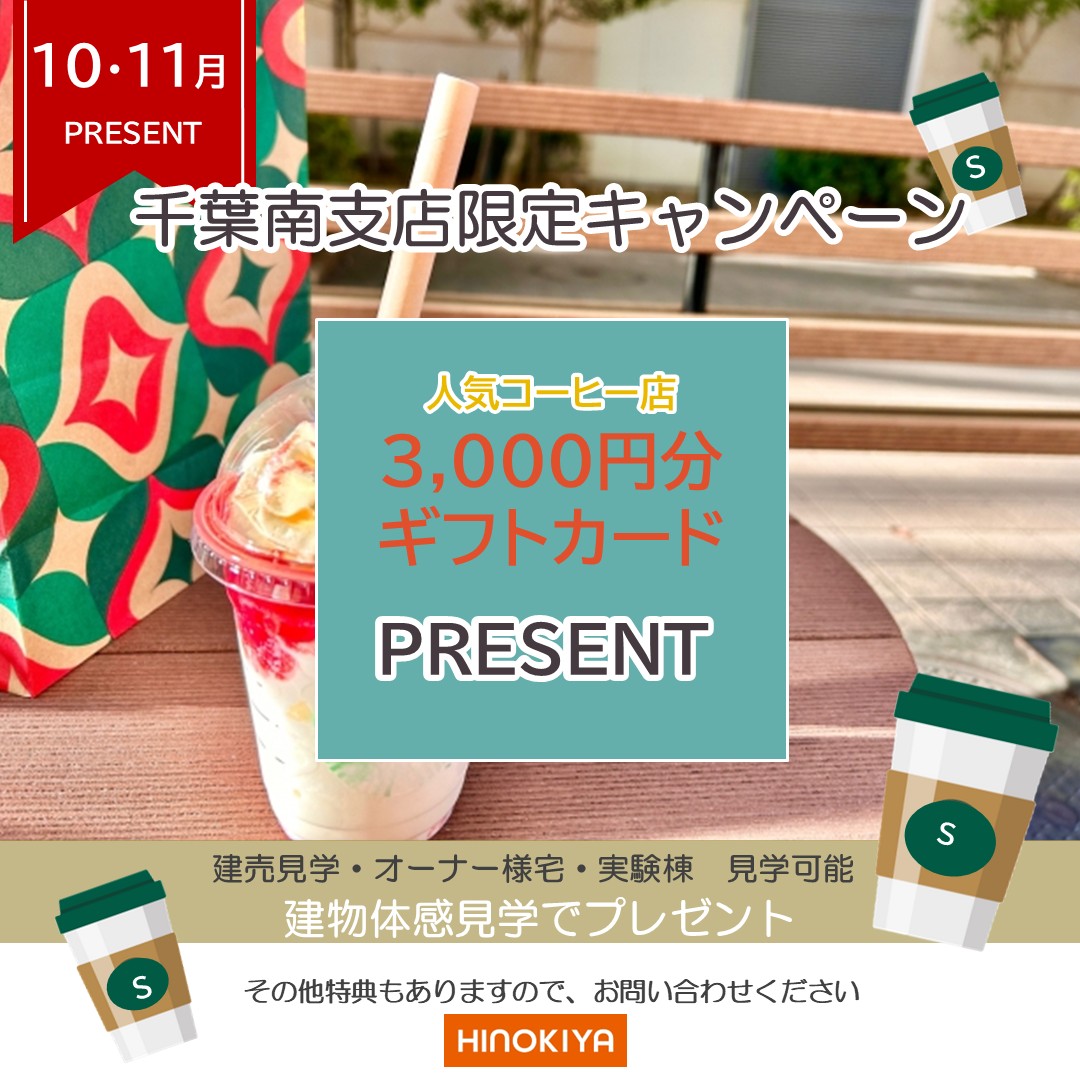 期間中に「建物体感見学」にご来場いただいたお客様へ、人気コーヒー店でご利用いただける3000円分のギフトカードを進呈いたします。