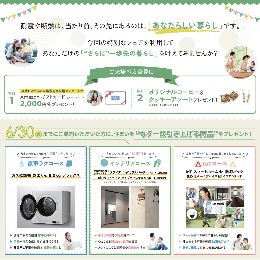 6月30日までにご成約いただいた方には、理想の暮らしを叶えるための商品が選べるコースを1つプレゼントいたします!