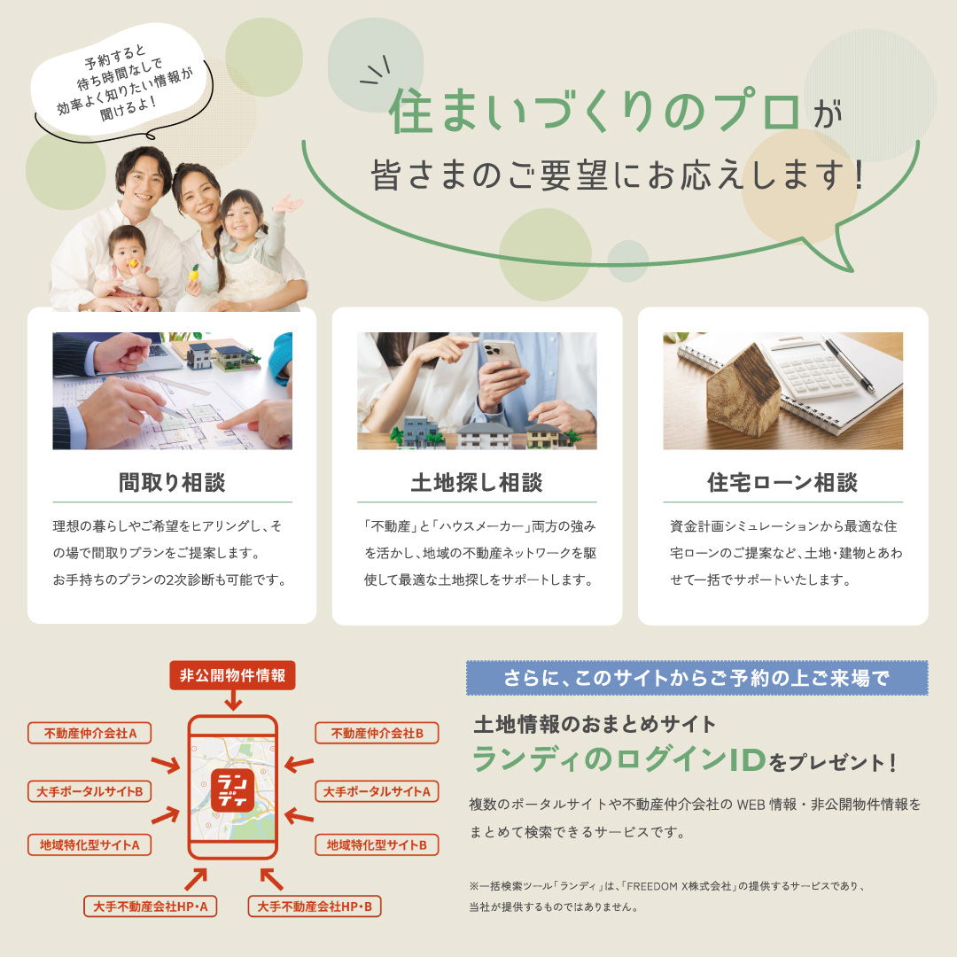 さらに、ご予約の上ご来場いただくと土地情報検索ツール「ランディ」のログインIDをプレゼント!非公開物件など、最新の土地情報をまとめて検索できる便利なツールです。