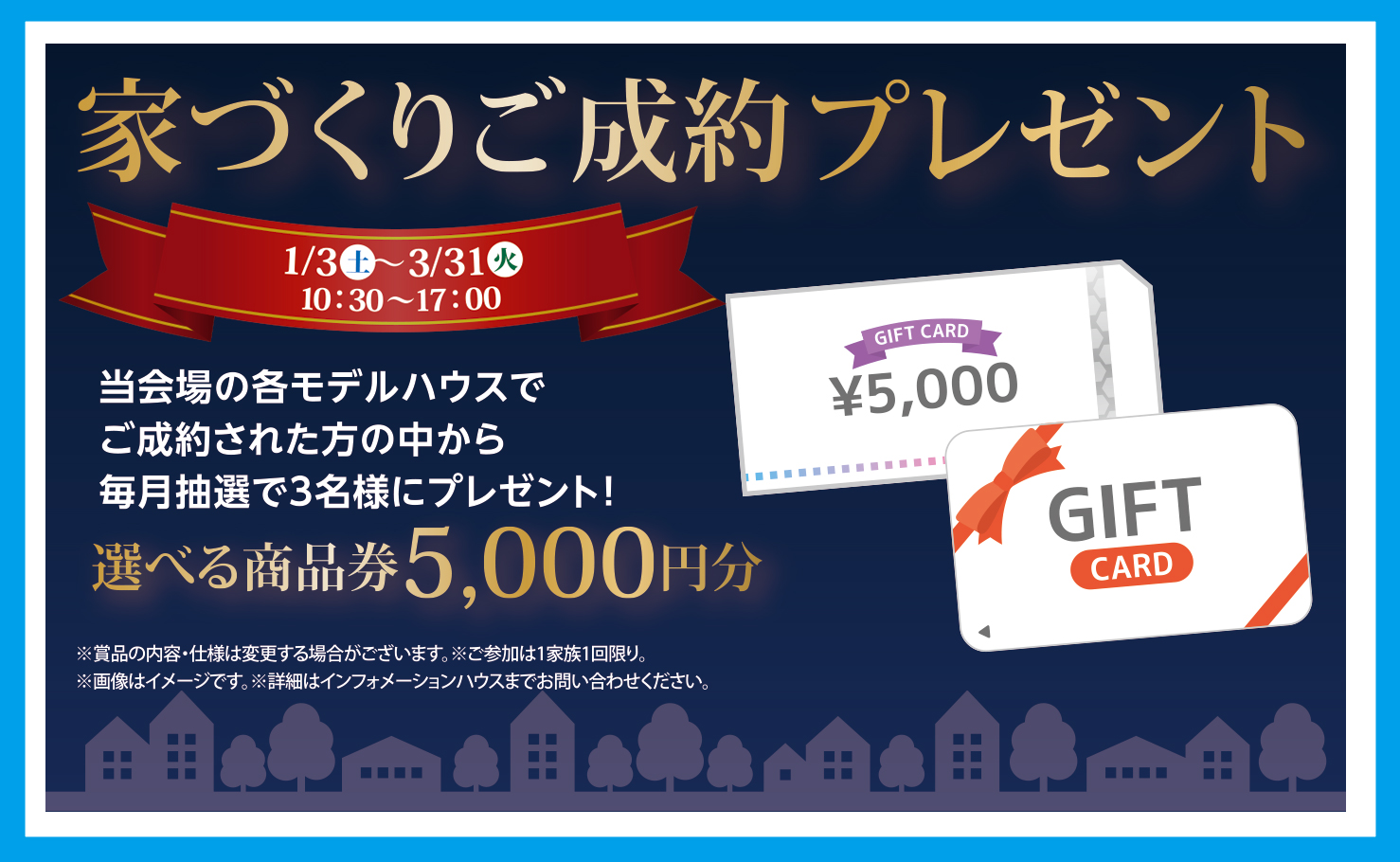 当会場の各モデルハウスでご成約された方の中から毎月抽選で3名様にプレゼント!